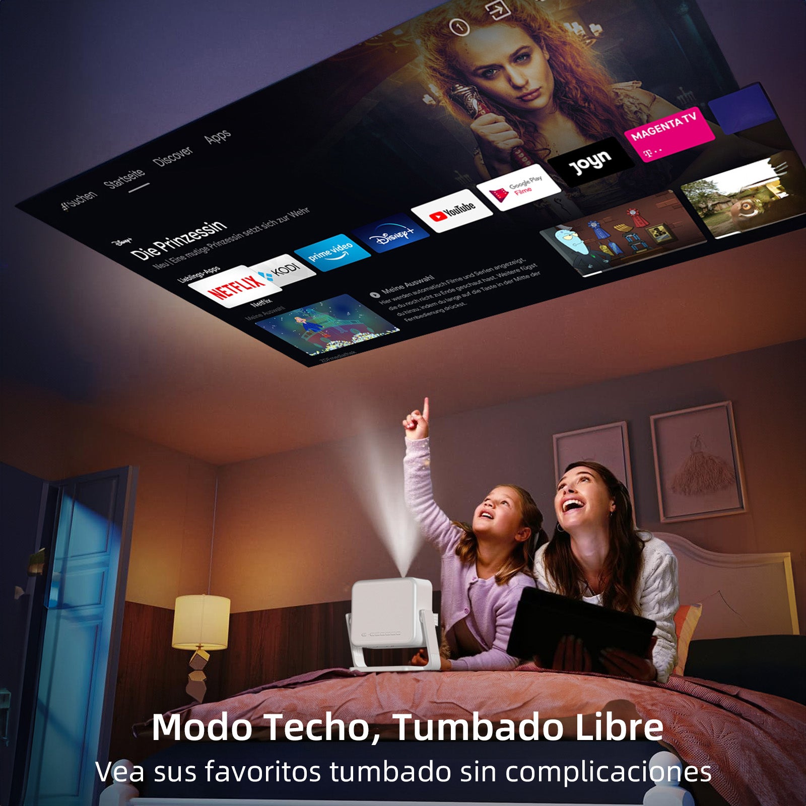 This WiFi and Bluetooth projector rotates 90° to switch between front and ceiling projection, featuring four-point keystone correction to adapt to different projection situations. Ideal for home cinema, business presentations and creative projections.