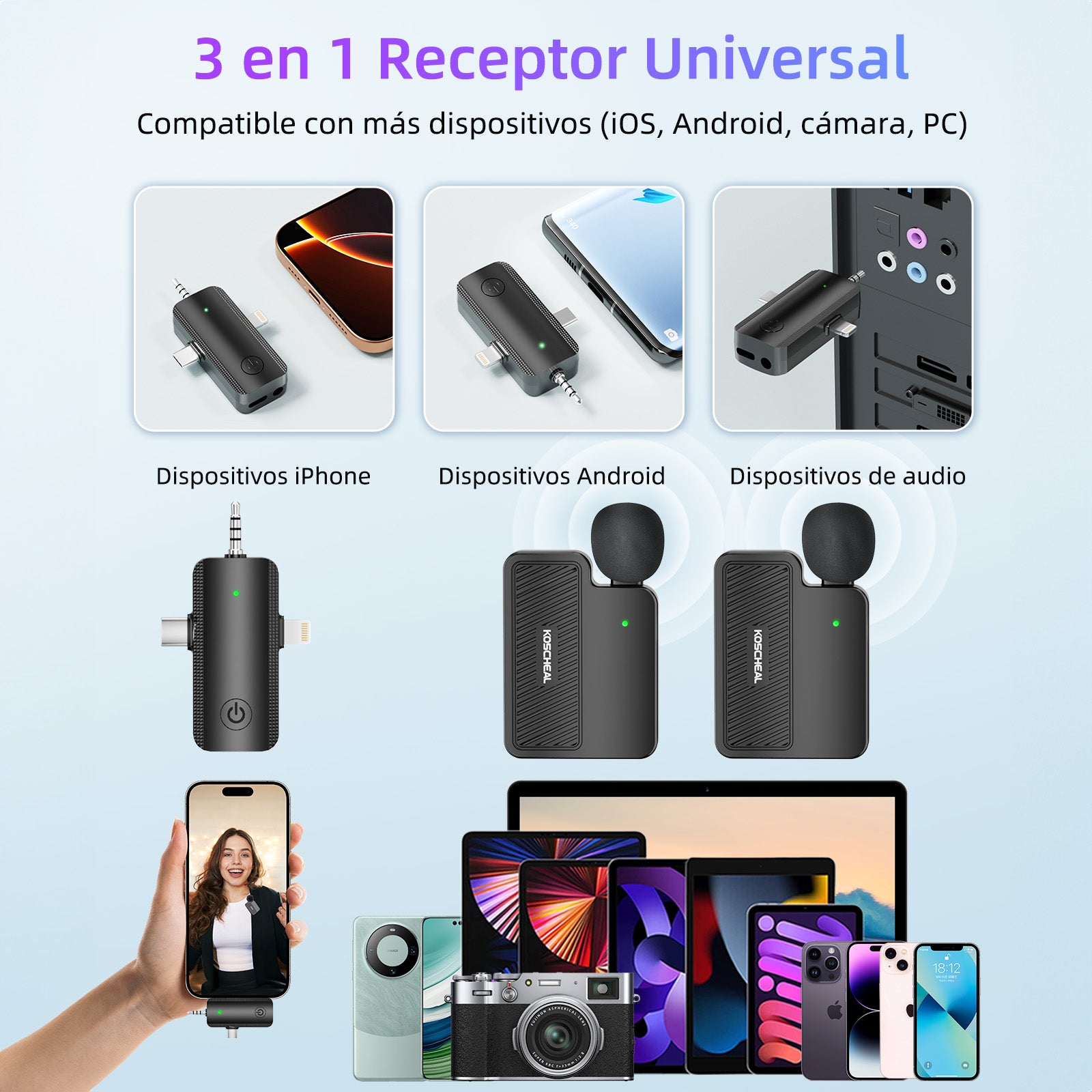 This upgraded professional wireless microphone for iPhone comes with a universal 3-in-1 receiver, eliminating the need for multiple connectors or cables. Compatible with Android phones, iPhone, iPad, laptops, cameras, etc. Includes a storage bag for convenient accessory organization.