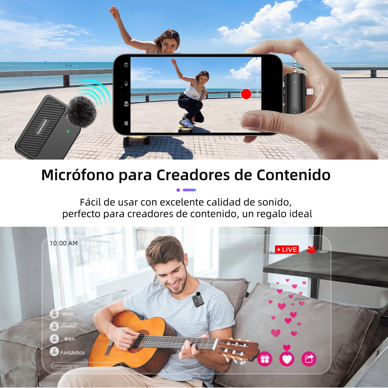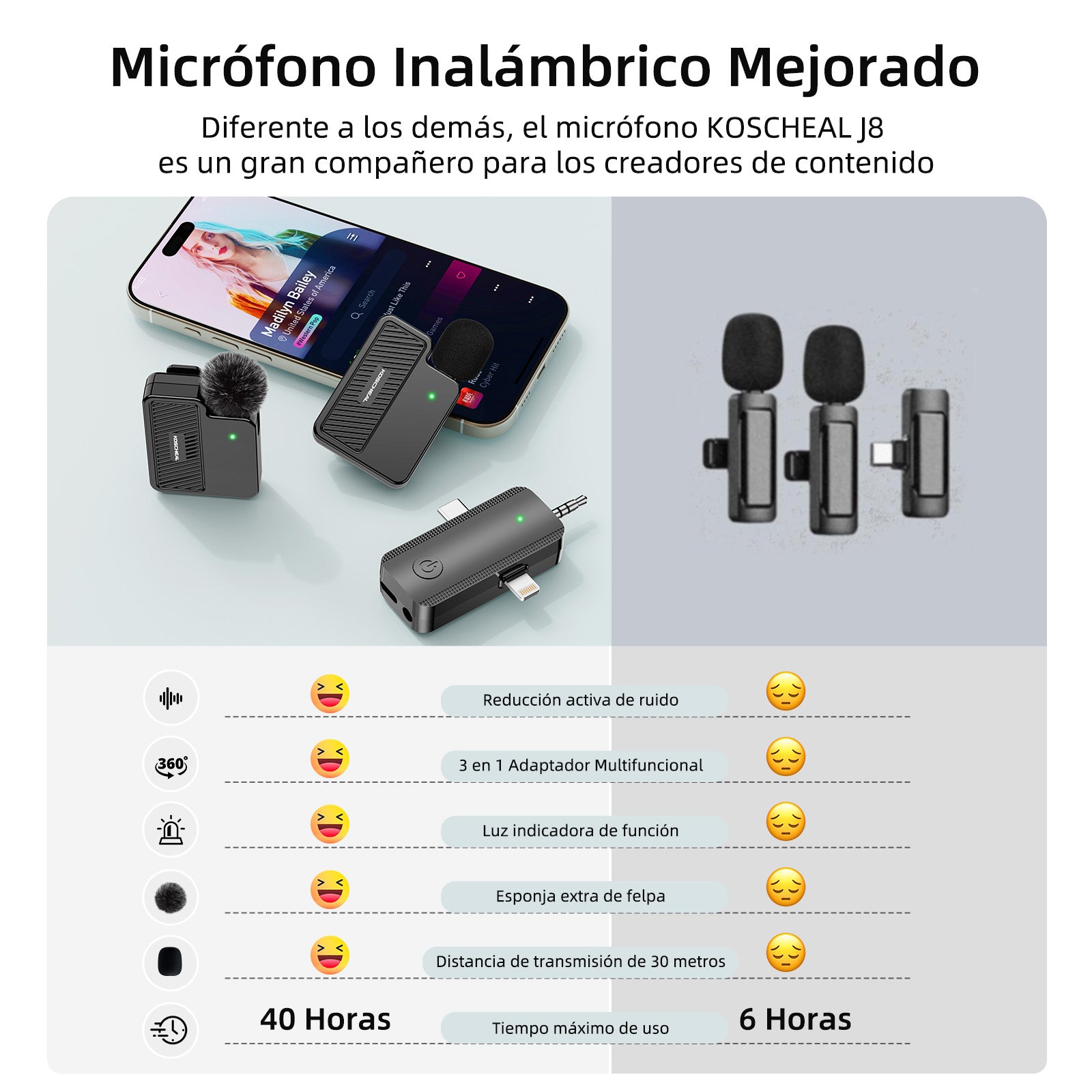 KOSCHEAL KOS-J8 3-in-1 Wireless Microphone - 40H Battery & Noise Reduction