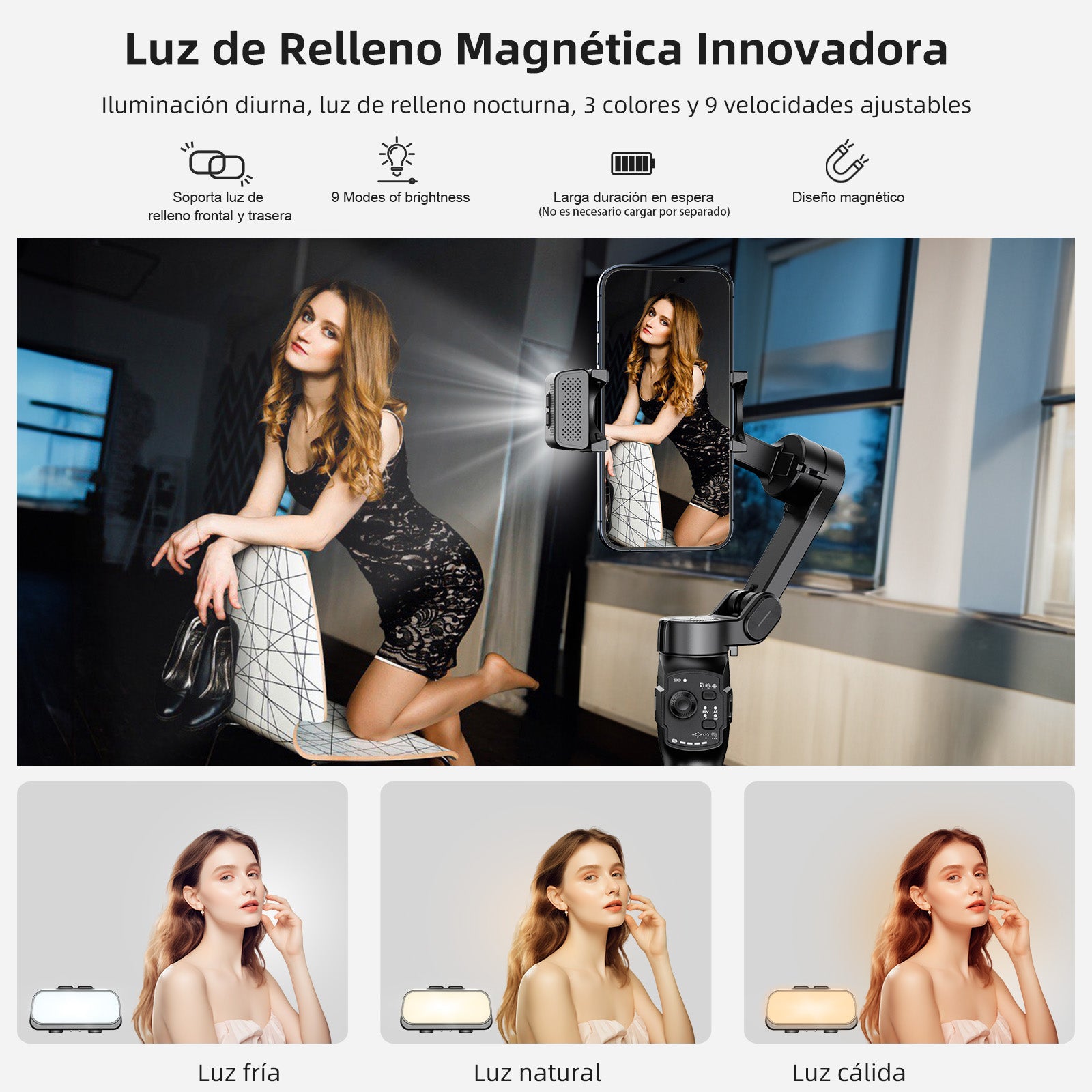 Innovatively equipped with a magnetic fill light that can be used on both front and back. Offers 3 colors and 9 brightness levels: cool, warm, and natural light. Ensures bright, beautiful photos even in dark environments.